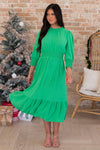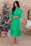 You are so going to enjoy the new Harmony! This dress is perfect for a night out, dress it up for a fancy dinner day or dress is down for a day out with the girls! Whatever you need this dress will be the it dress for you! Featuring, a high modest neckline, quarter length smock hemmed sleeves, a flattering smocked waistline and the perfect length ruffle hem skirt! Get yours quick before they are all gone!