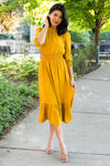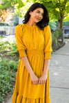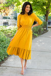 You are so going to enjoy the new Harmony! This dress is perfect for a night out, dress it up for a fancy dinner day or dress is down for a day out with the girls! Whatever you need this dress will be the it dress for you! Featuring, a high modest neckline, quarter length smock hemmed sleeves, a flattering smocked waistline and the perfect length ruffle hem skirt! Get yours quick before they are all gone!