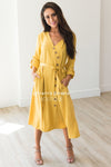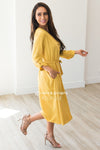 This new arrival is a modest fashion home run! We love the color and button detailing, we simply can not get enough! Featuring soft v-neck with functional button front detailing, long sleeves, pocket and a belt tie waist. Get yours before they sell out!