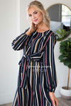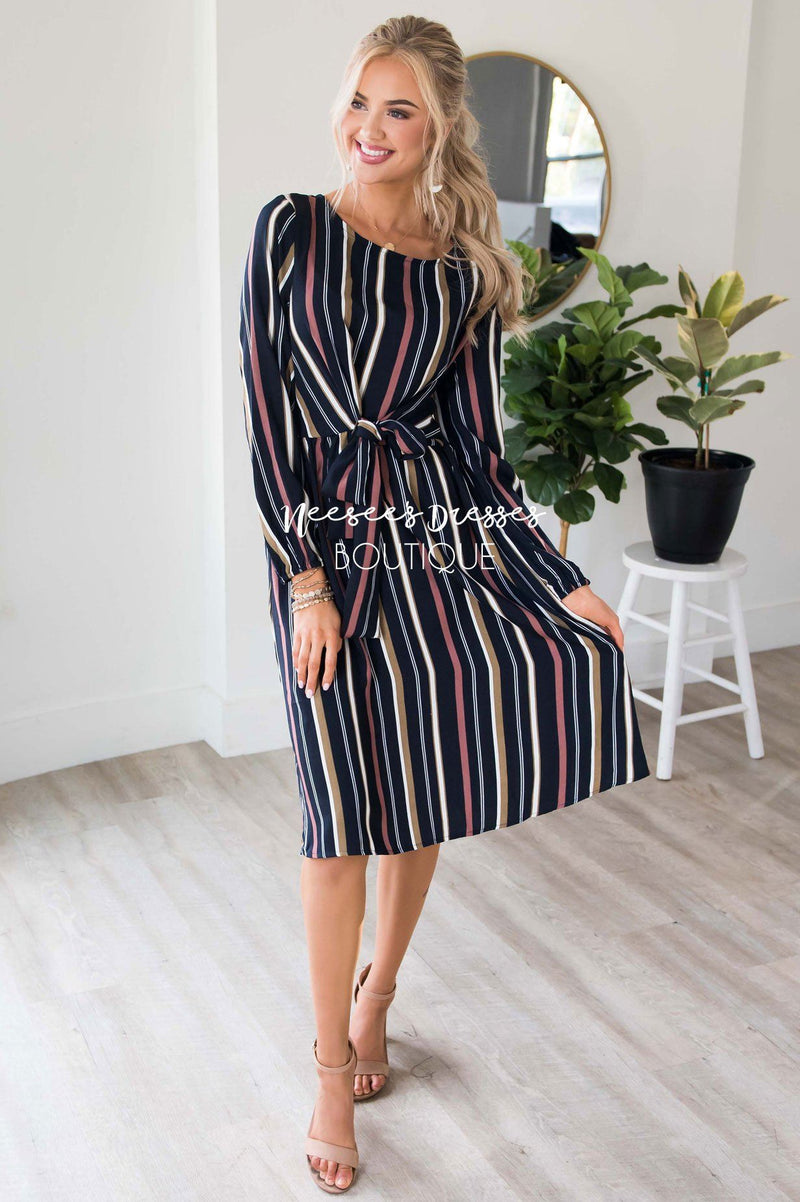 Oh hello there gorgeous! Our new Havannah Dress is chic and sophisticated. Featuring bold navy, dusty mauve, sage and white stripes, long sleeves and a pretty waist tie for the perfect fit every time. Back zipper closure.