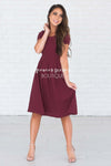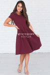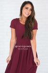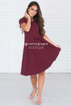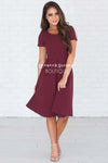 This dress is perfect for all your up coming fall weddings and occasions! We are obsessing over the simple chic vibe of this dress. This dress is so universal, you can dress it up or down depending on the occasion and weather. The Hazel features a stunning shade of burgundy, a pleated waist, a textured waffle weave fabric, a scoop neck and short sleeves.
