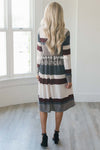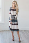Oh so comfy and cute! You cannot go wrong this fall with this adorable new dress! this dress features dress cream, burgundy, charcoal, and gray contrasting stripes a gathered waist, a fit and flare fit and side pockets.