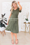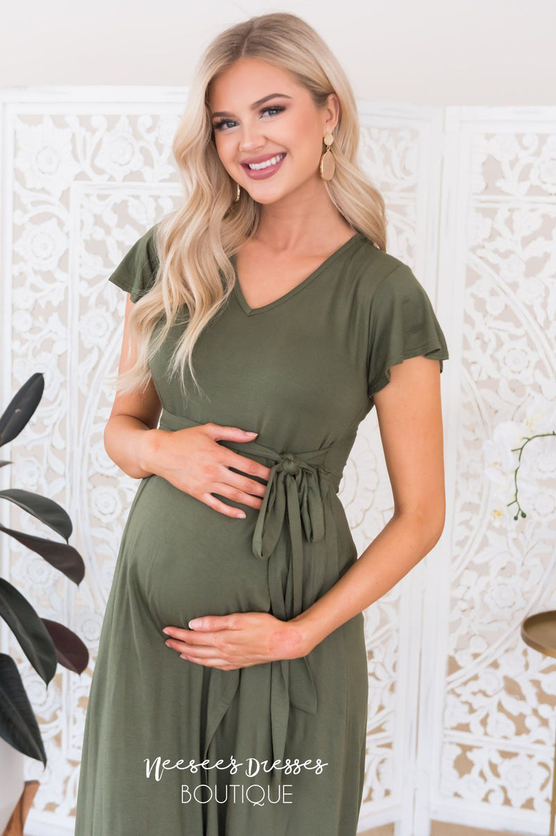 Beyond beautiful! This flowy dress is a summer dream come true! Light weight, olive dress features short flutter sleeves, a modest v neckline, waist tie sash and a faux wrap skirt.