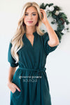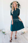 The Helena is a gorgeous as they come and perfect for all your holiday parties! stunning dark emerald dress features a v neckline half sleeves, buttons down the front (non-functioning), a waist tie sash and side seam pockets. Lined.