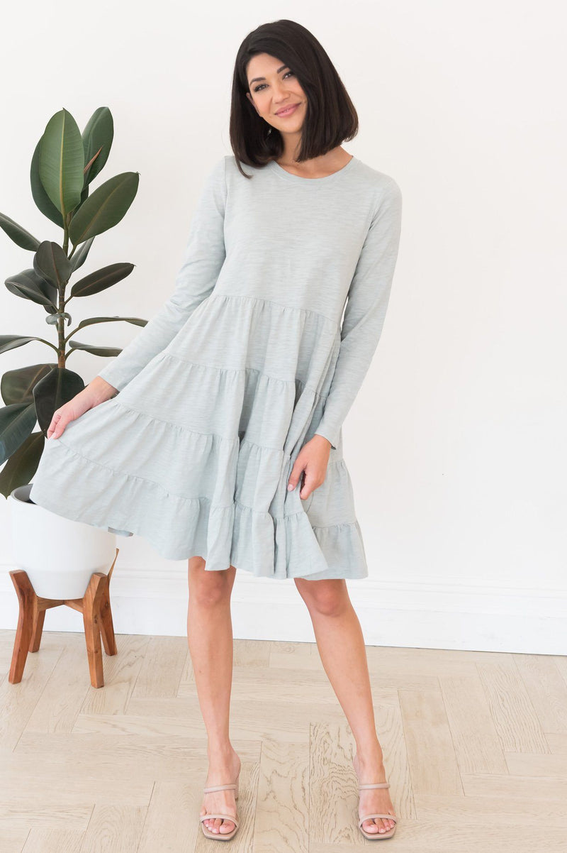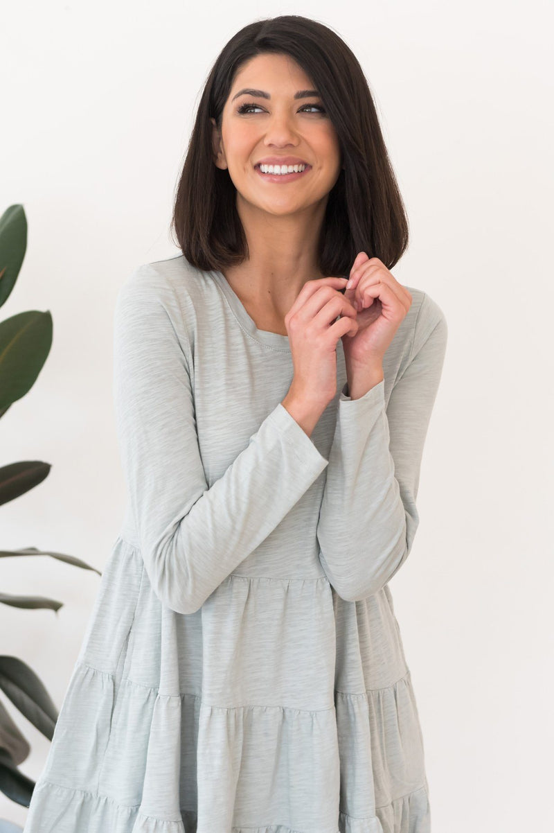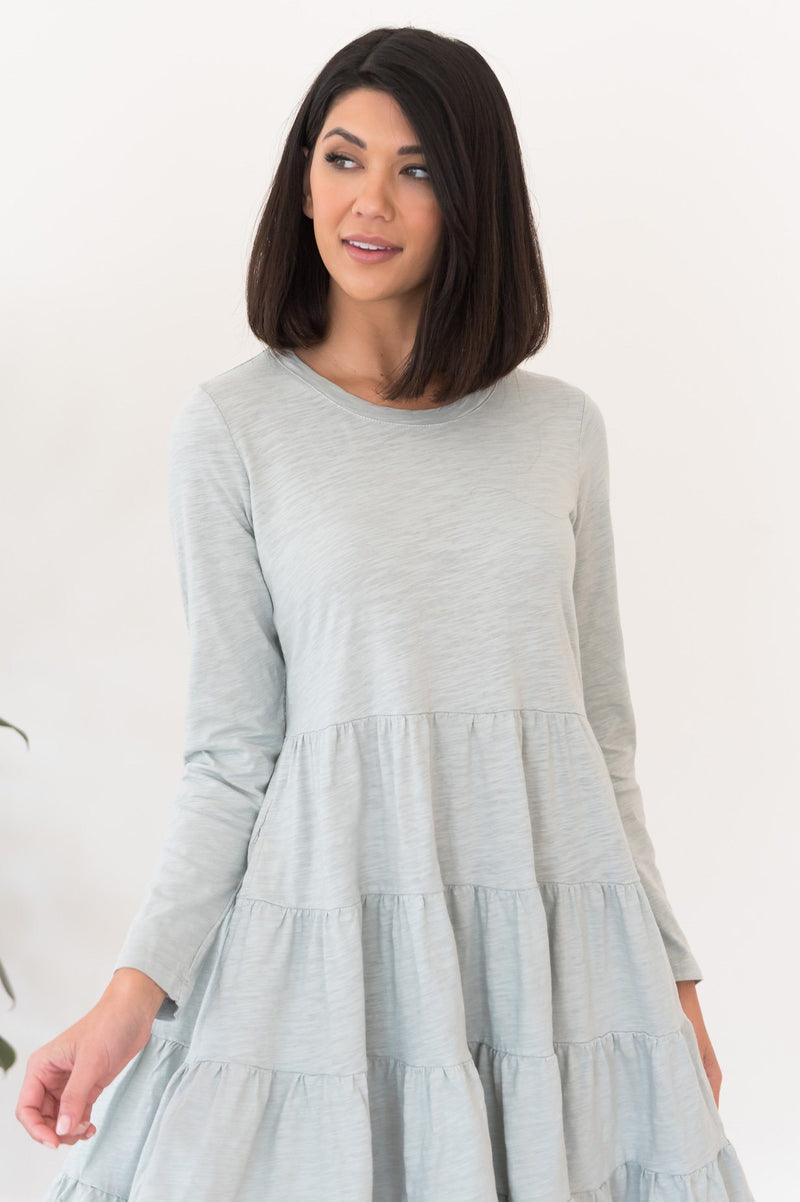 This long sleeve midi is as cute as they come! There is nothing not to love about this casual comfy beauty! Featuring long sleeves, a tiered ruffle skirt, and a beautiful heather grey color! Get this pretty dress before it's gone!