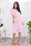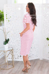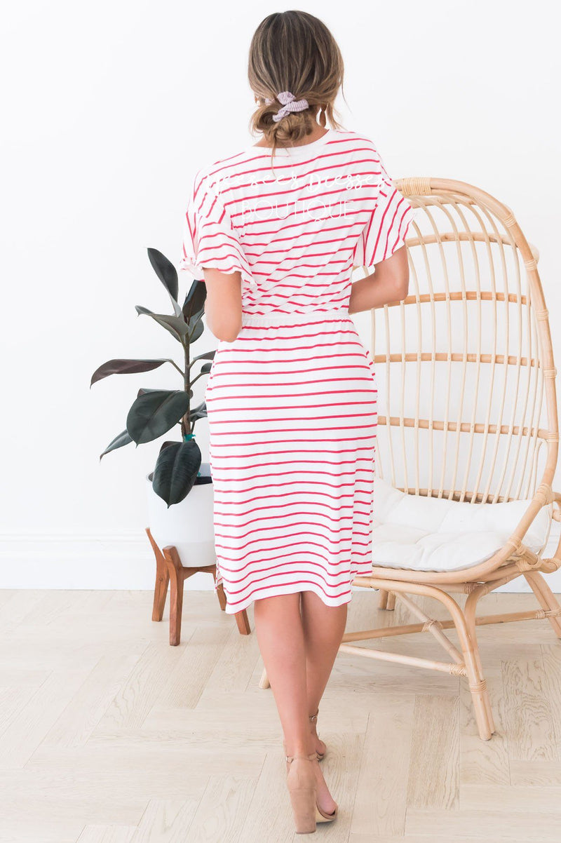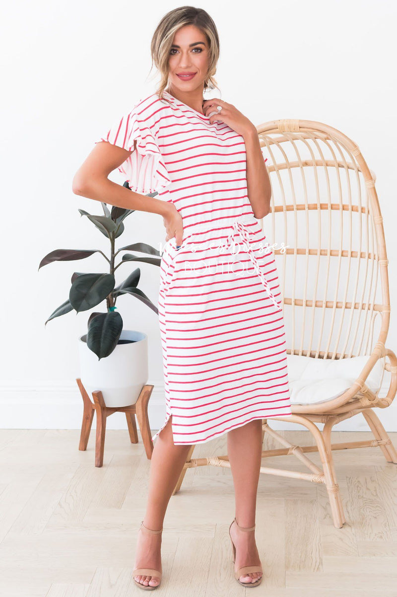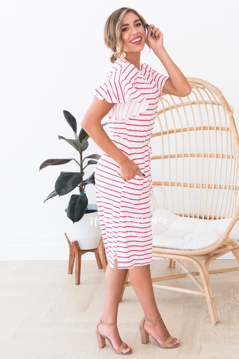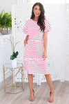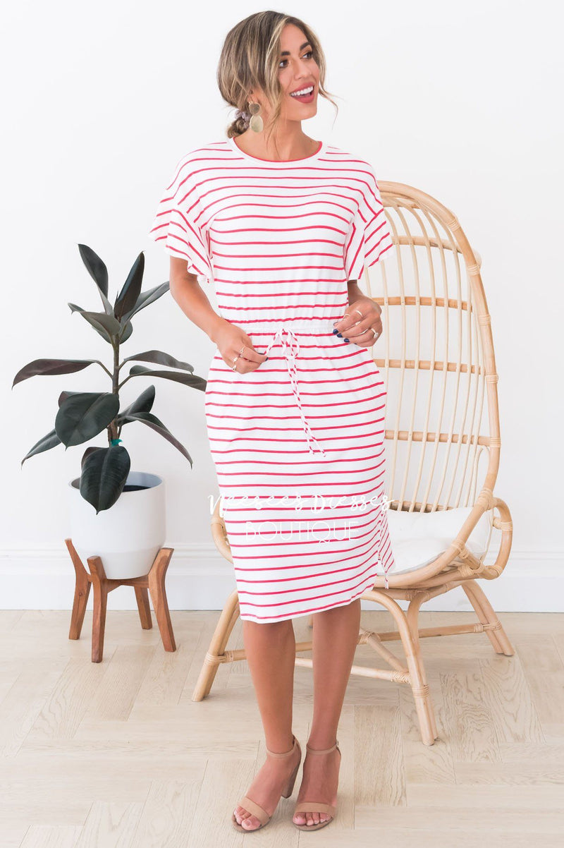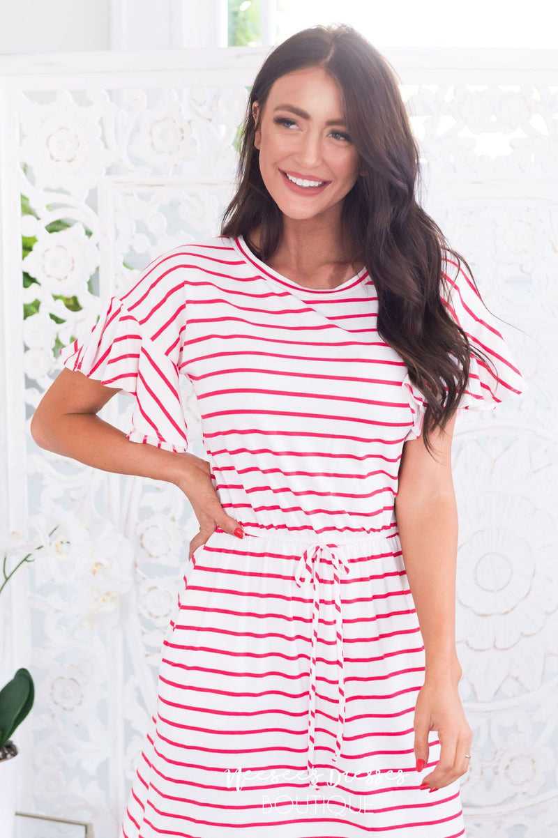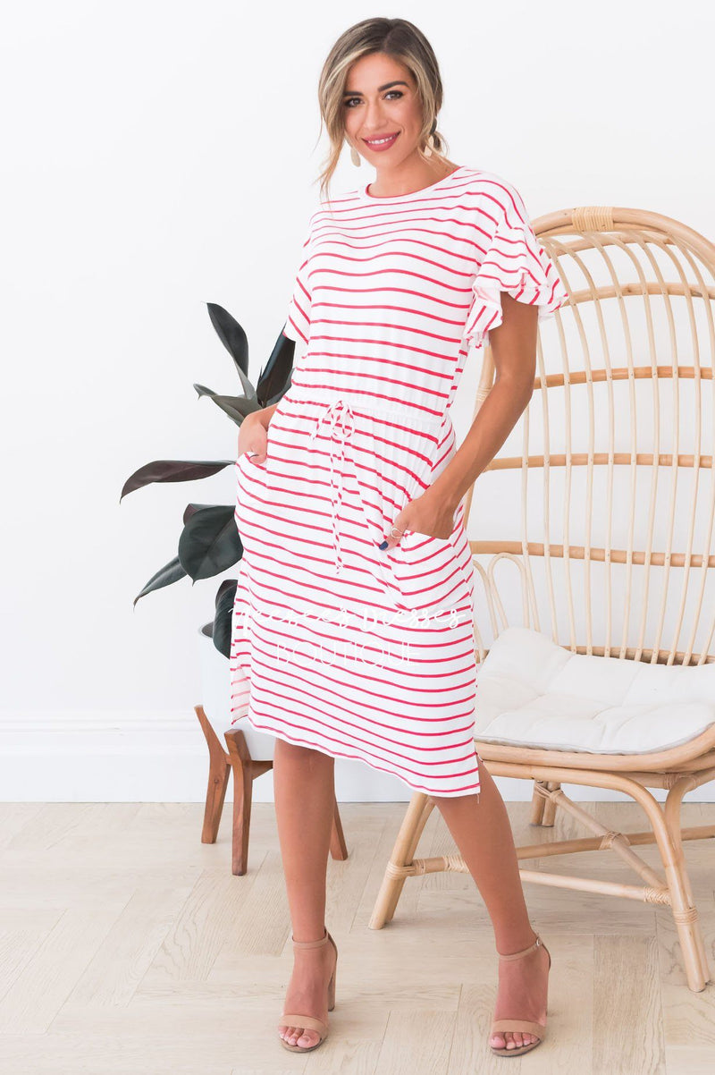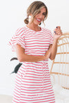 The Hilliry is bound to be one of your new favorites! We love the coral stripes on the ivory, it gives this Hilliry the perfect pop of color! Featuring a round neckline, short ruffle flutter sleeves, super soft and cozy material and a drawstring waist. Get yours today!