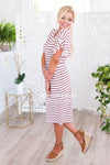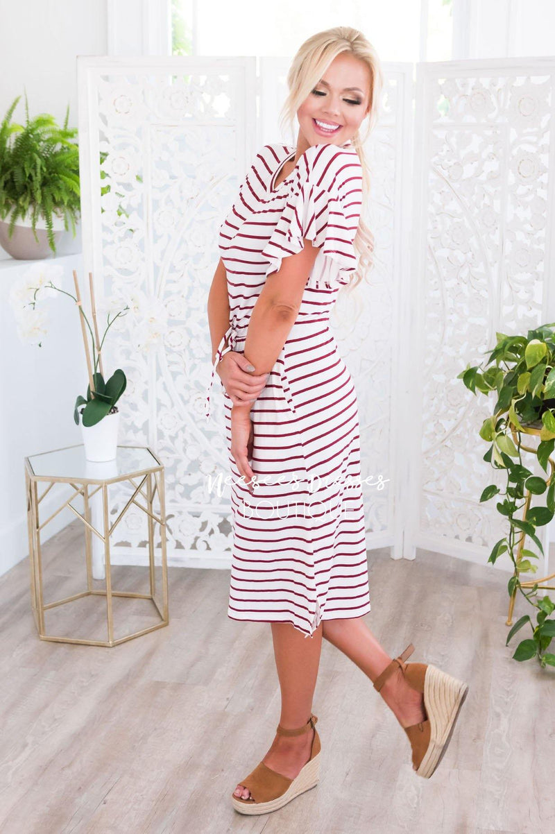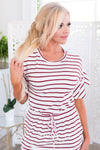 The Hilliry is bound to be one of your new favorites! We love the wine stripes on the ivory, it gives this Hilliry the perfect pop of color! Featuring a round neckline, short ruffle flutter sleeves, super soft and cozy material and a drawstring waist. Get yours today!