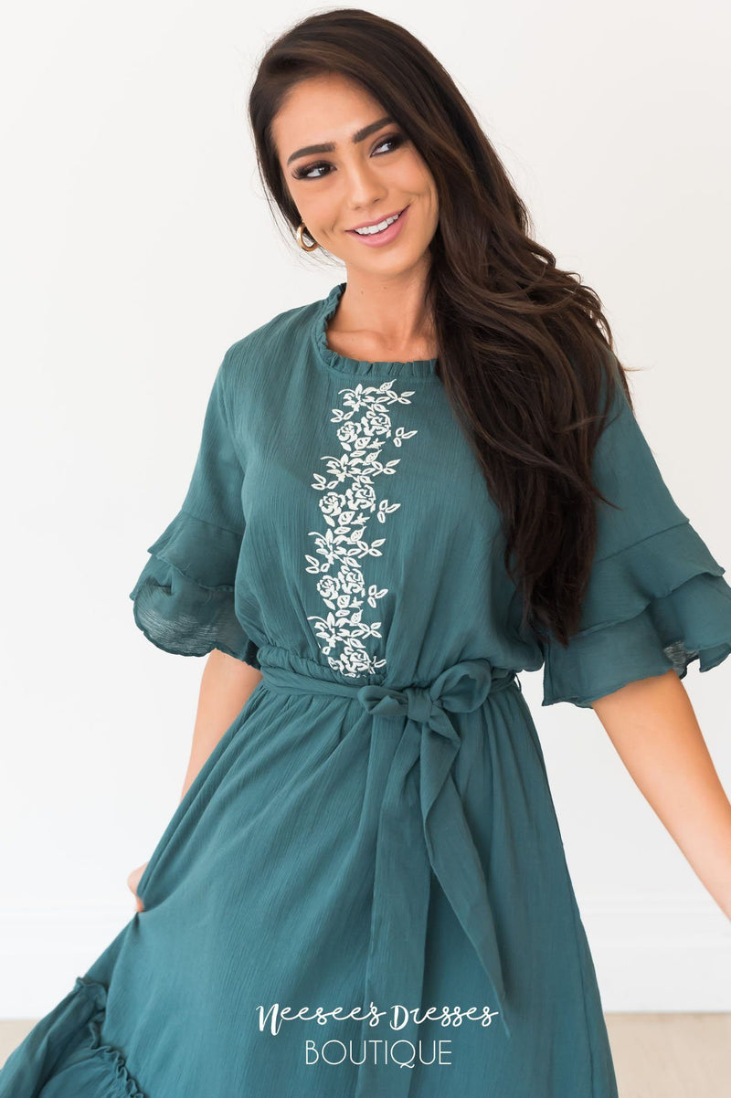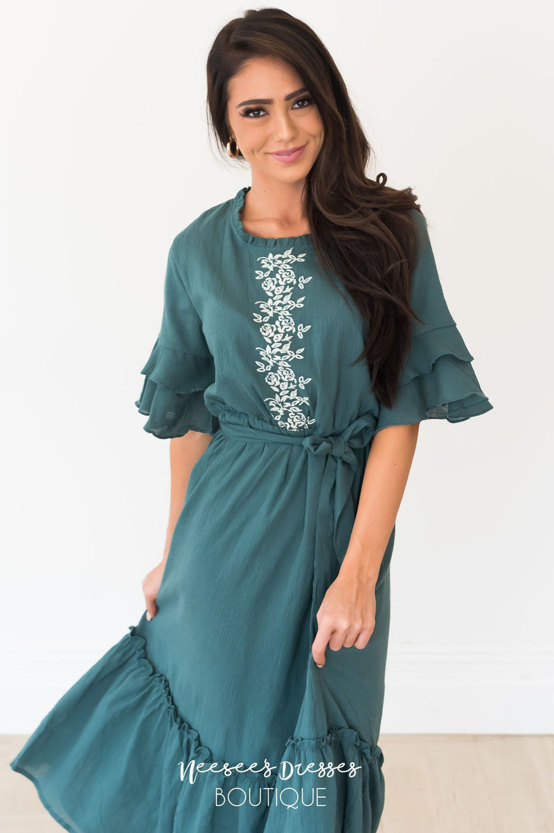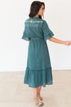We are loving this New Arrival! Seriously, the dark jade color with the most darling delicate ivory embroidery, half double ruffle sleeves, feminine ruffle hem skirt and let us tell you about the crepe material! These dresses will be gone in a flash, get yours today!!!