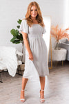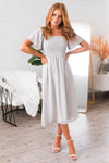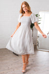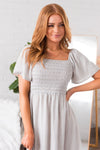 Twirling into the gorgeous Spring weather with the new Holland dress is a dream! Features include short flutter sleeves, smocked bodice, perfect tea-length skirt and a dreamy cream/greyed jade floral print.