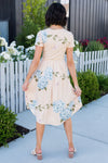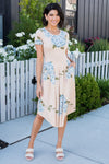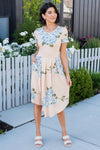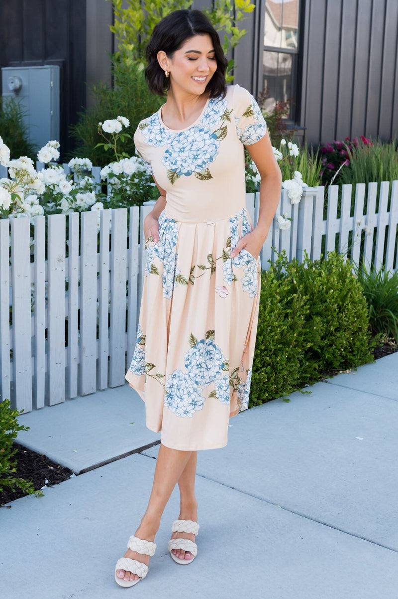 This beautiful floral dress is so easy to love all season long! We love this stunning these colors for spring and summer, its such a delicate and beautiful combination! Pretty in peach dress features a gorgeous butterfly floral print, a pleated waist, short sleeves, rounded hem and side pockets.