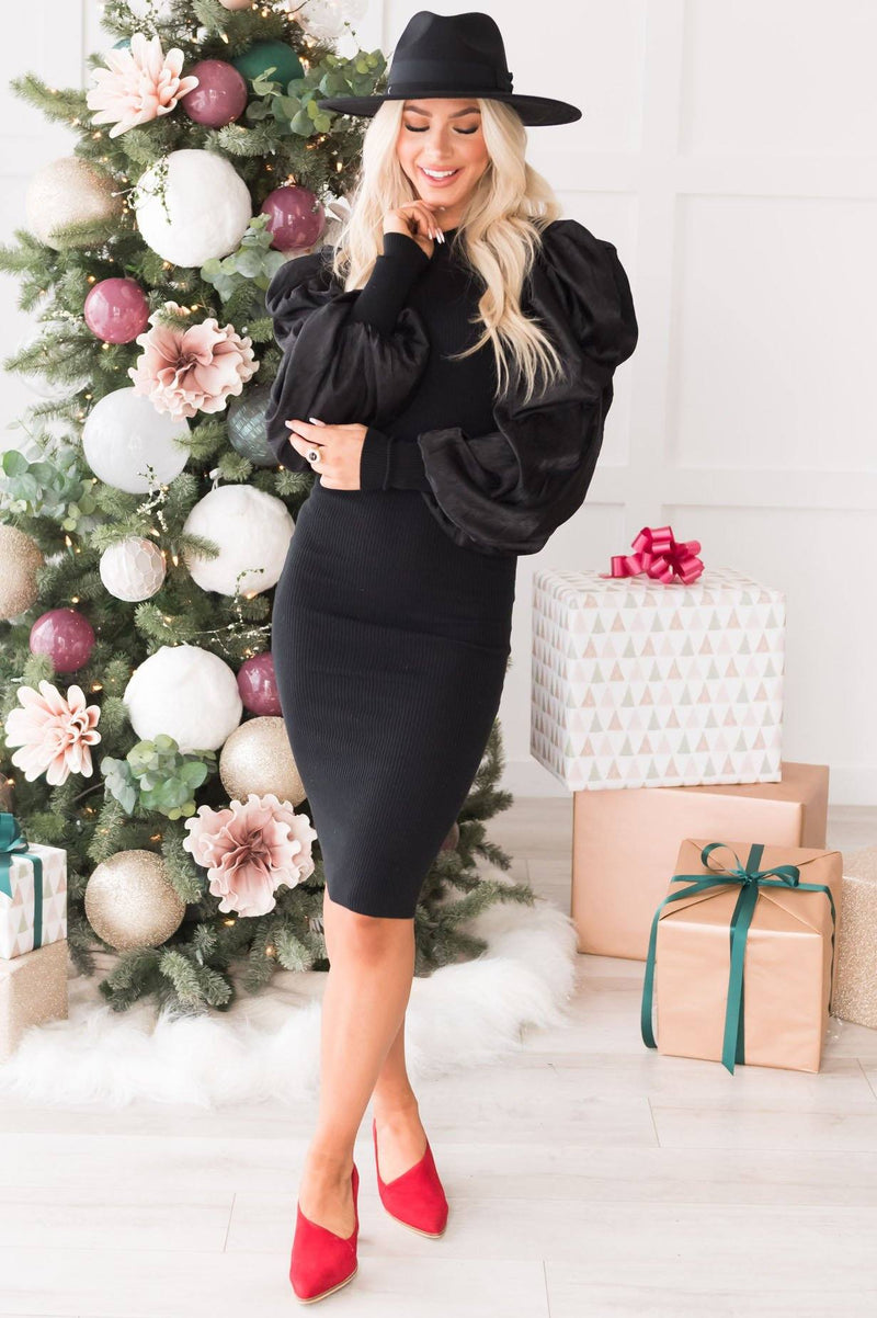 The Hunter is simply the most darling black dress around! Featuring fabulously flowy long satin puff sleeves paired perfectly with a gorgeous trendy pencil fit bodice. This is the perfect dress to take you from Thanksgiving well into the New Year! Get yours today