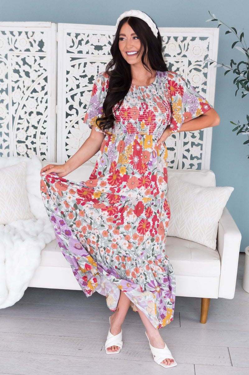 The Hylda swooped in and stole our hearts! This lovely boho floral dress has all the best features! To include, half length flutter sleeves, squared neckline with a smocked bodice and a full flowy maxi skirt. Get yours today, these beauties will go fast!