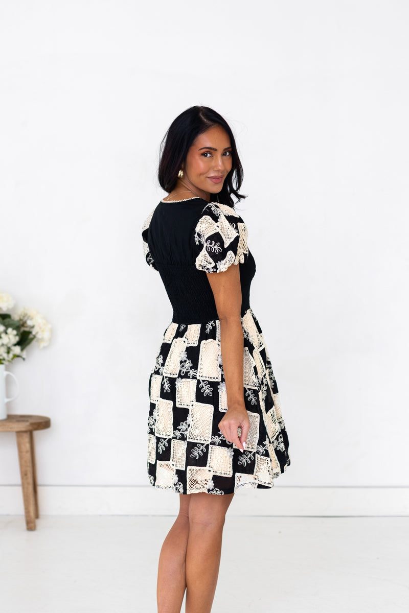 The perfect dress is about to find you! The lovely checkered Illary is a showstopper! Featuring slip on style, lace detailed v-neckline, short bubble sleeves and a flowy fit and flare crochet lace detailed skirt, we are obsessed! Get yours today!