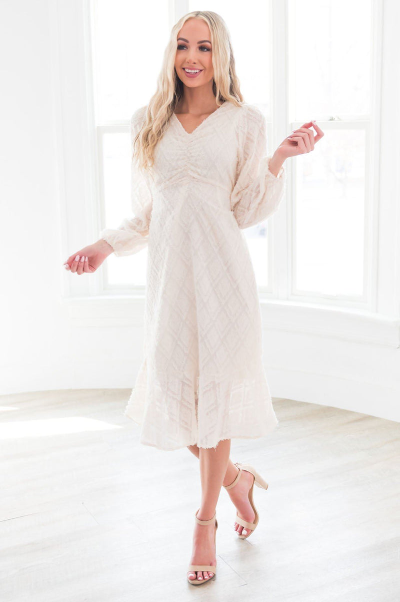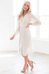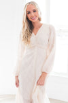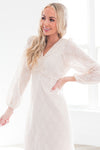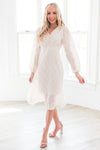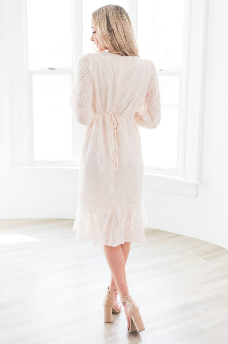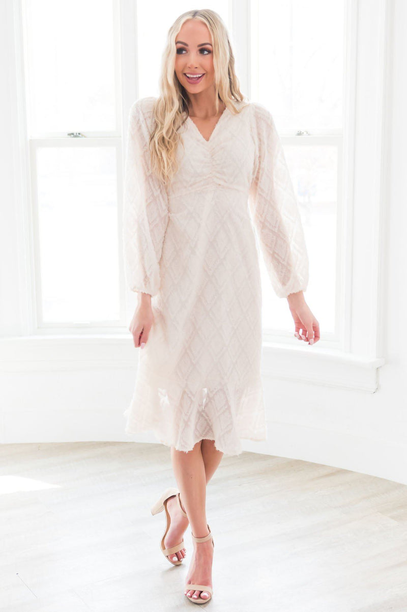 This darling little dress is bound to steal your heart! We are in love with the soft textured sheer material! It's so elegant and feminine! Features include a v-neckline with a ruched bodice detail, long sleeves and an elegant ruffle hemline. Get yours today!