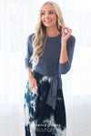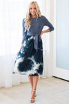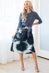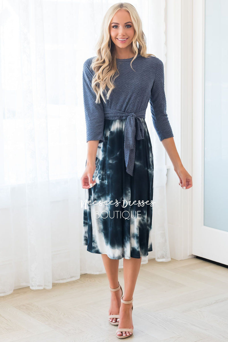 Tie Dye is the way to go this season! We are loving the classic style of this new India dress! Featuring a cozy soft swiss dot bodice with 3/4 length sleeves and belt tie waist. Finished off with the perfect compliment of darling tie dyed skirt. Get yours before these stylish modest beauties are all gone!
