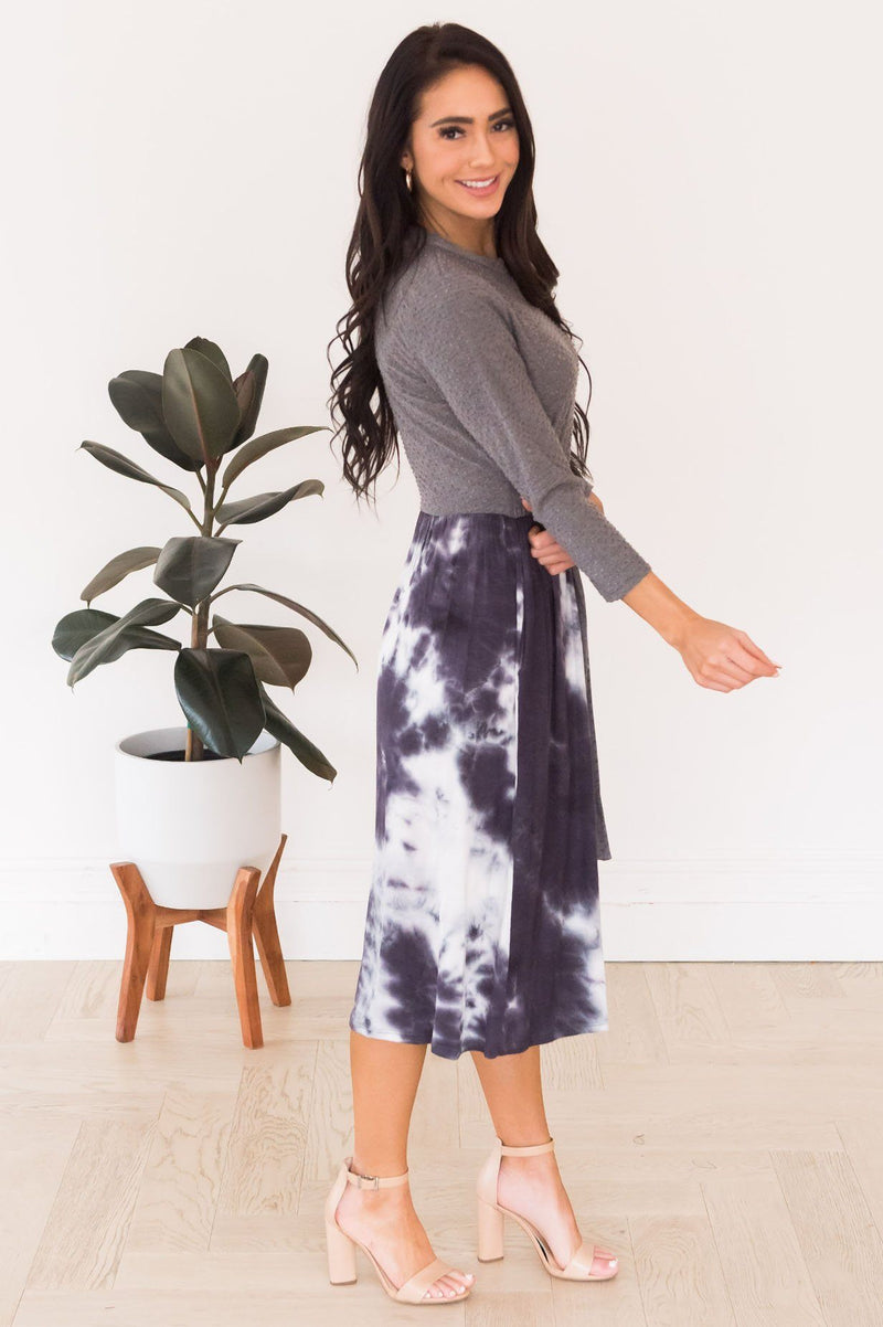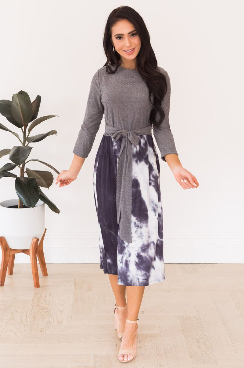 Tie Dye is the way to go this season! We are loving the classic style of this new India dress! Featuring a cozy soft swiss dot bodice with 3/4 length sleeves and belt tie waist. Finished off with the perfect compliment of darling tie dyed skirt. Get yours before these stylish modest beauties are all gone!