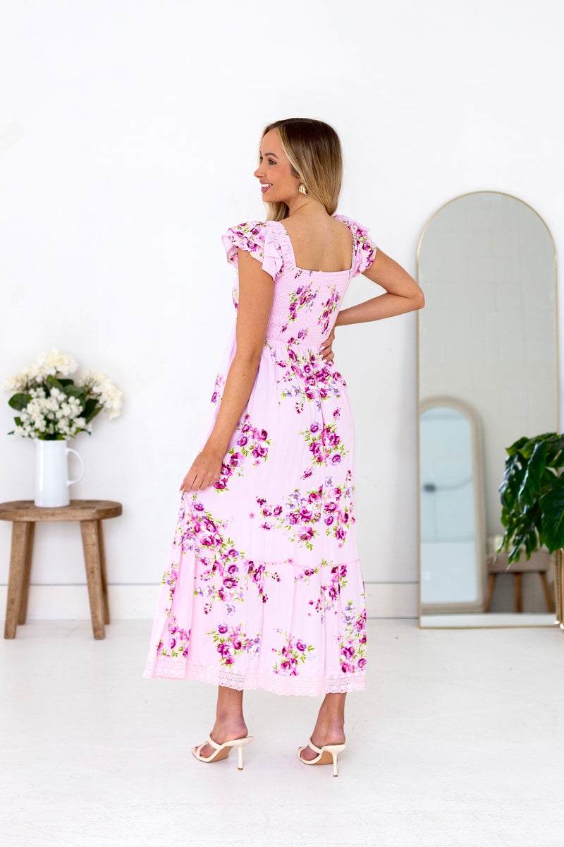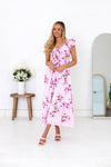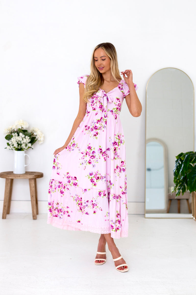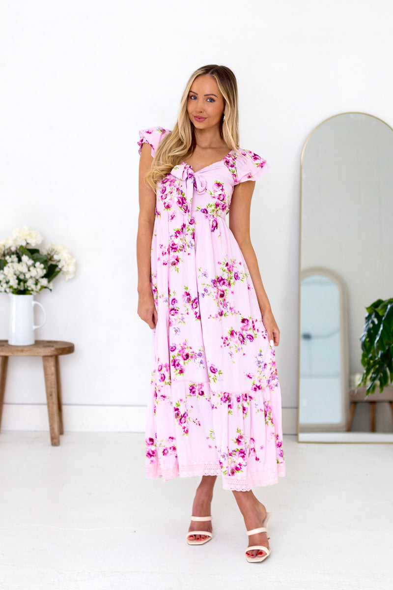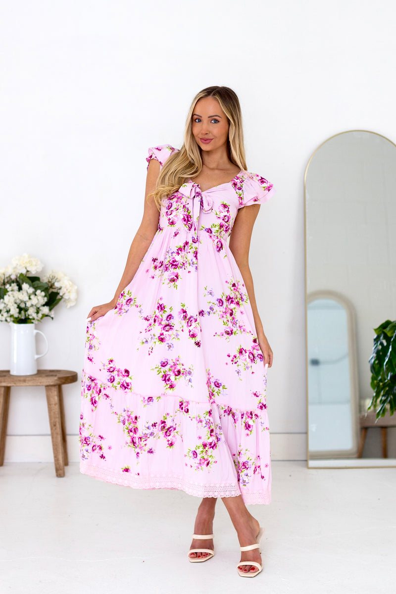 The perfect dress is about to find you! The lovely floral Indiana is a showstopper! Featuring modest v-neckline with a darling bow detail, flattering and comfortable smocked backing, adorable double flutter sleeves, flowy trimmed skirt and feminine blush floral, we are completely obsessed! Get yours today!