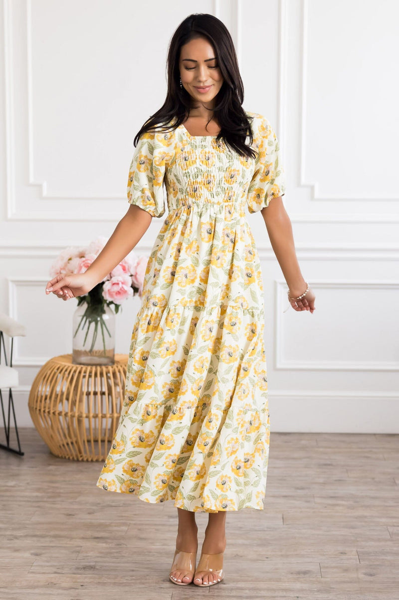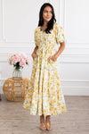 The darling retro floral Indy is twirl worthy and a must have for every wardrobe! Featuring a lovely flowy maxi length, short puff sleeves, flattering smocked bodice and pockets! You simply can not go wrong with this dress, add to cart now!