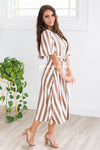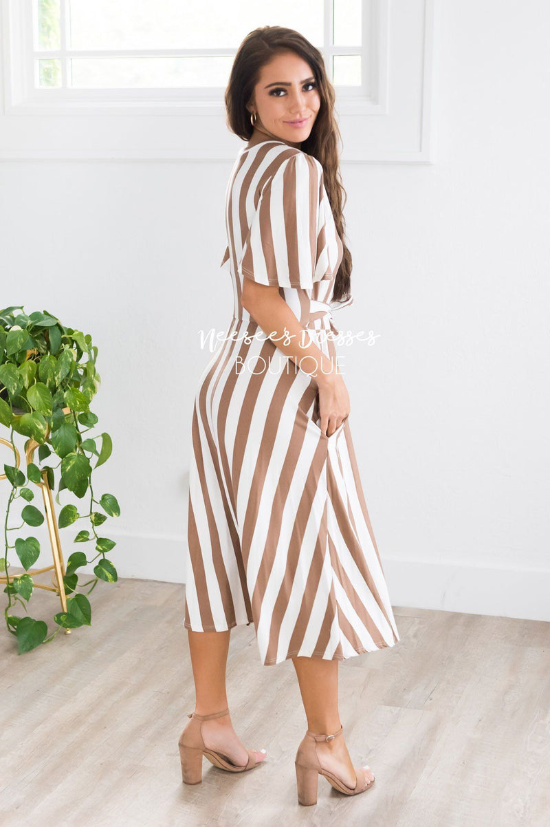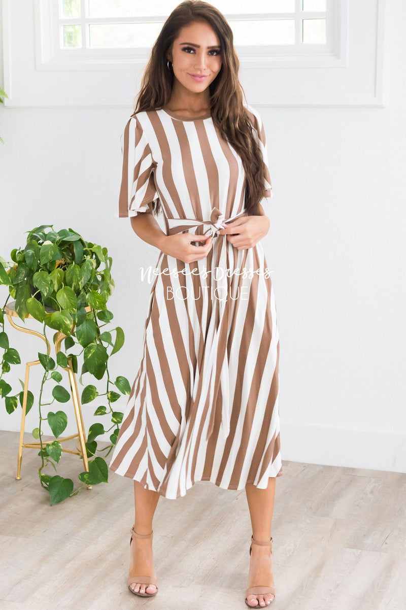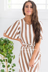Be ready to steal the show in this little show stopper! The material is literally the most buttery soft thing you will ever let touch your skin. Making it perfect for all day comfort. Plus we just adore stripes and know you do too! This dress features a round neckline, flutter short sleeves, self tie detail(nondetachable) and it has pockets!