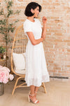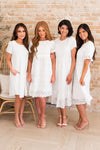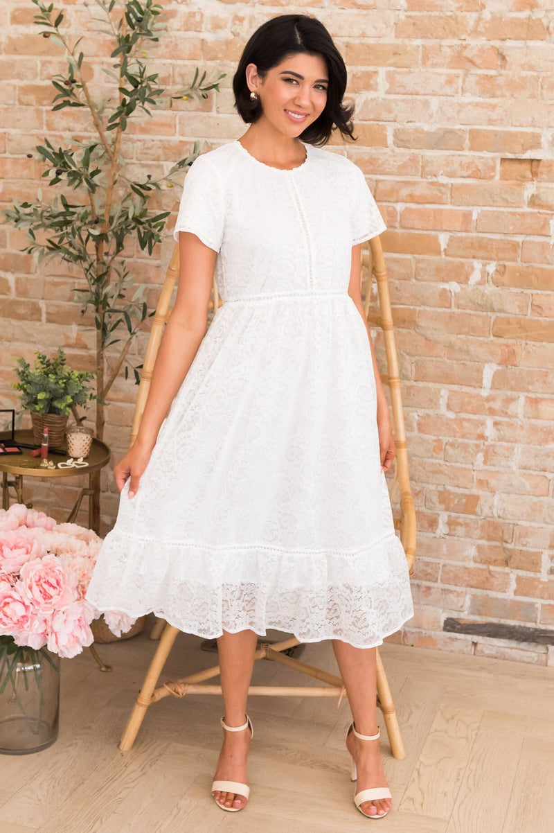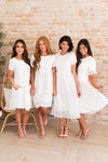 Summer is here and the Isabel is the perfect dress for it! Grab this lovely lace, eyelet embroidered dress for all your upcoming special events! Featuring a modest round neckline, short sleeves, zipper back closure and a feminine ruffle hem skirt.