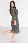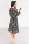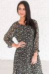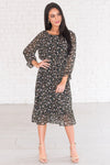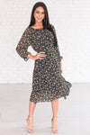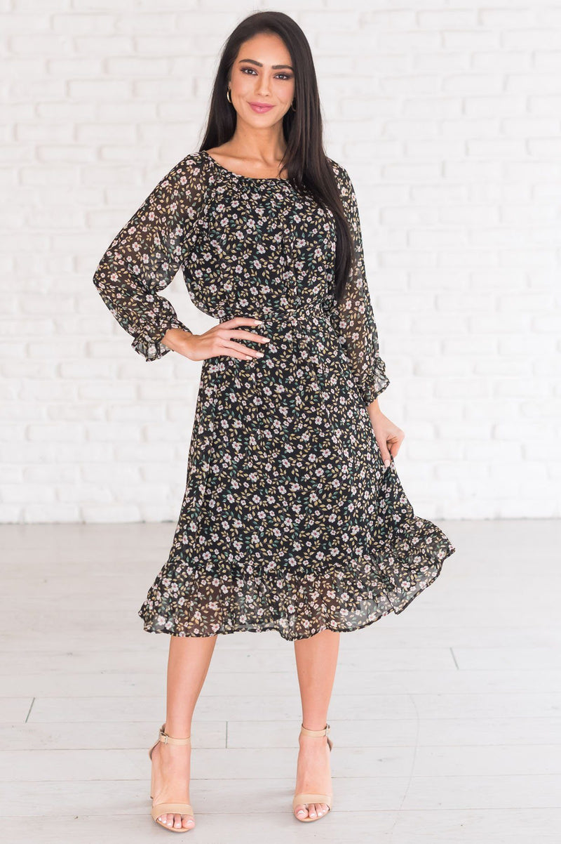 With Spring just around the corner we've got you covered with the darling new Isabell! This floral mid-length dress is oh so classy! We are loving the flowy feminine fabric, high modest neckline, belt tie waist, 3/4 length sleeves and the most gorgeous little ruffle at the hemline. Get yours today!