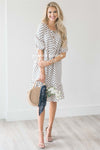 This cream dress features navy polka dots a button front, baby doll fit and 3/4 length bubble sleeves!