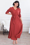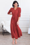 Create the perfect fall outfit with this stunning new maxi dress! You will fall in love with this gorgeous rust maxi, it is seriously the perfect dress for fall! This gorgeous dress features a beautiful swiss dot overlay, a v-neckline, a belt tied waist, half length sleeves with elastic details, and a full length maxi skirt. You won't want to miss out on this beauty!