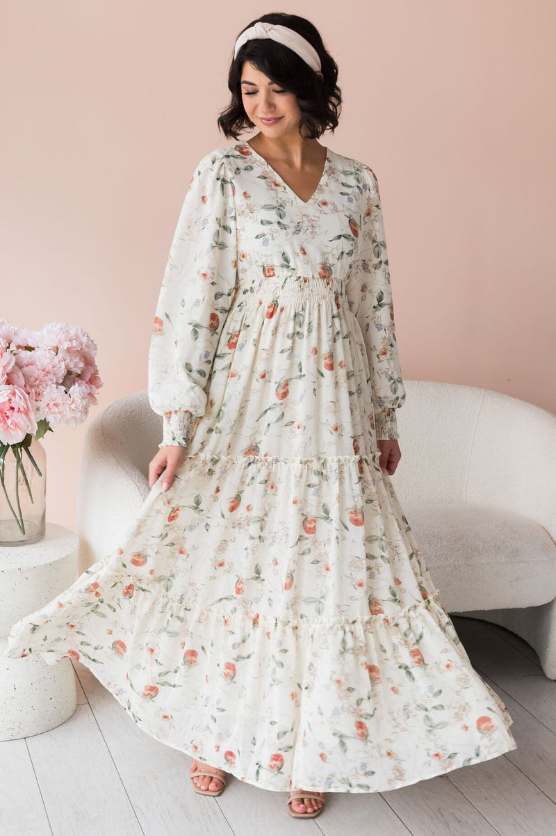 Elegance at its best! The darling new Jacey dress has got our attention and we are sure it will have yours too! Soft v-neckline, gorgeous long sleeves, smocked waistline and a flowy tiered maxi skirt, what more can we say?! This beautiful floral print has stolen our hearts!