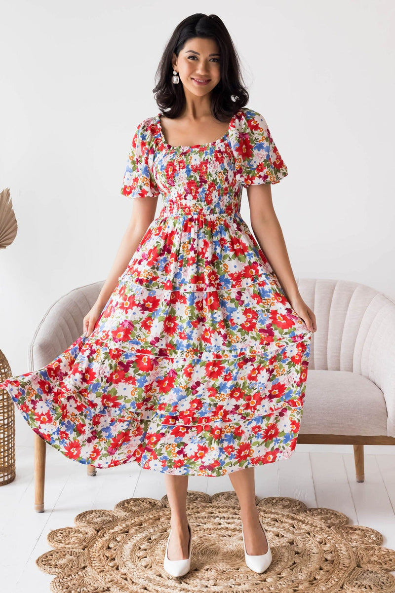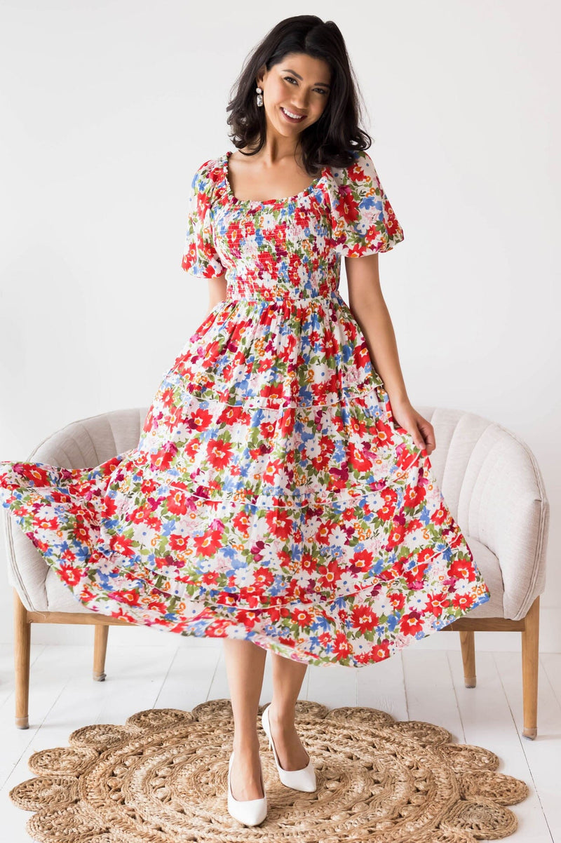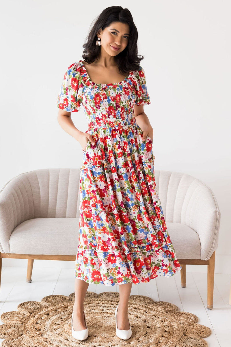 The most feminine colorful beauty has arrived and is a true must have! The Jackalyn is perfect for any occassion, featuring a flattering smocked bodice, half length puff sleeves, pockets and the most gorgeous ruffle tiered skirt. Get yours today!