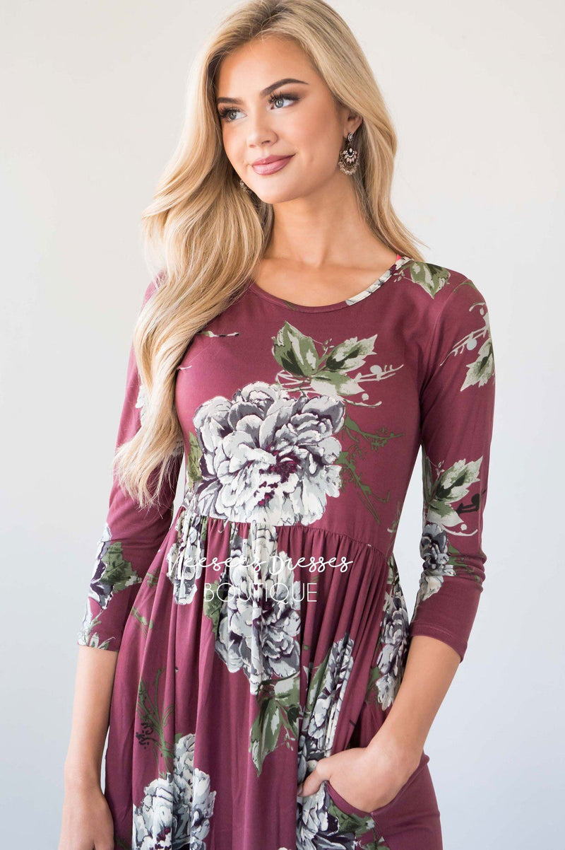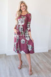 This adorable floral dress is fall perfection! Cute dusty plum dress features a gray floral print, has an elastic waist, 3/4 length sleeves, and adorable side seam pockets!