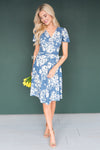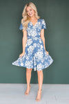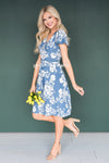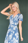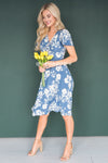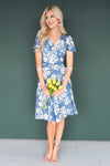 We are loving the gorgeous blue floral mid-length dress! So fun and classy at the same time. Featuring a faux wrap style with a belt tie waist, swing style skirt and cozy soft material. The dress is unlined and the beauty comes in short sleeves. Get yours today!