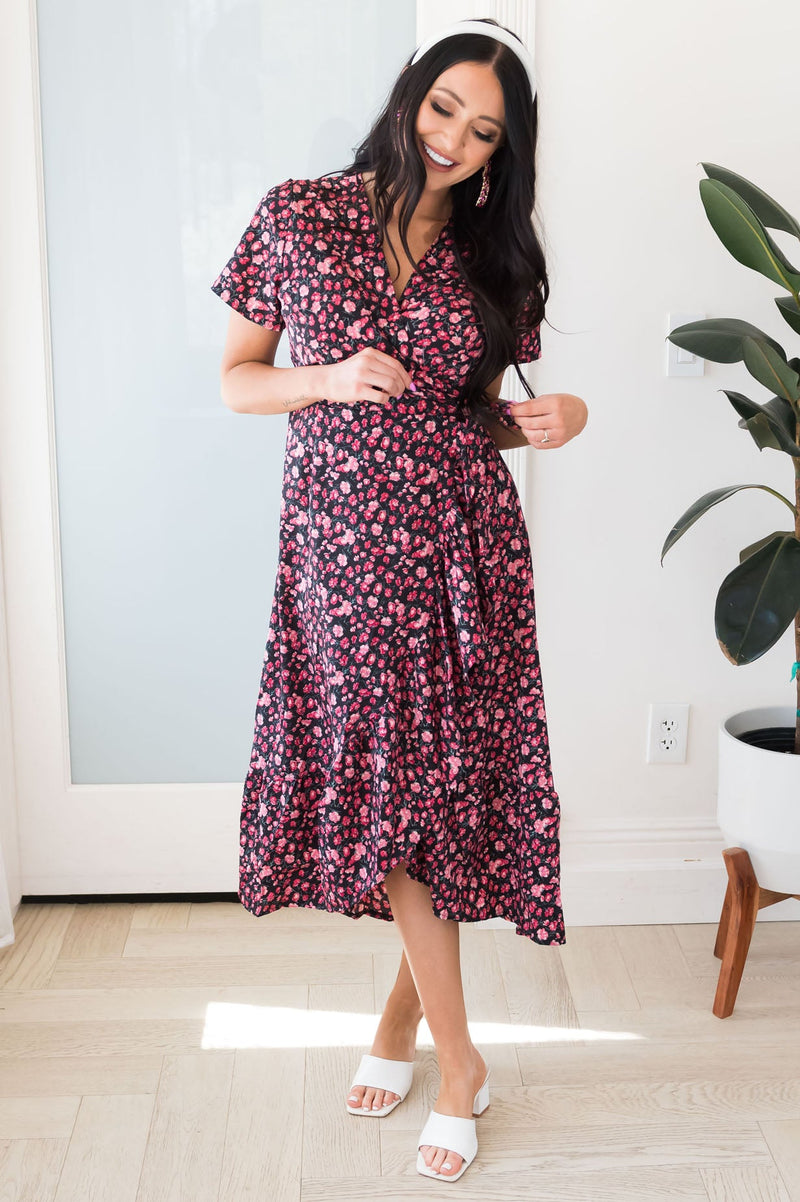 The Jane Elle is one gorgeous modest wrap dress! Trust us when we say you are going to want to add to cart now because this darling dress will sell out quickly! Features include lovely floral paisley print, short sleeves and a high-low ruffle skirt.