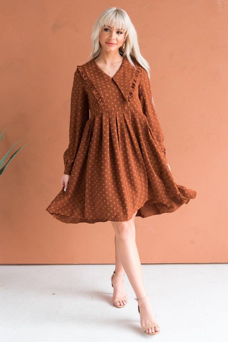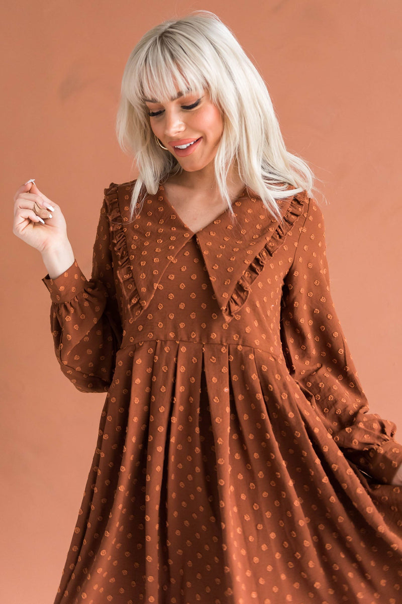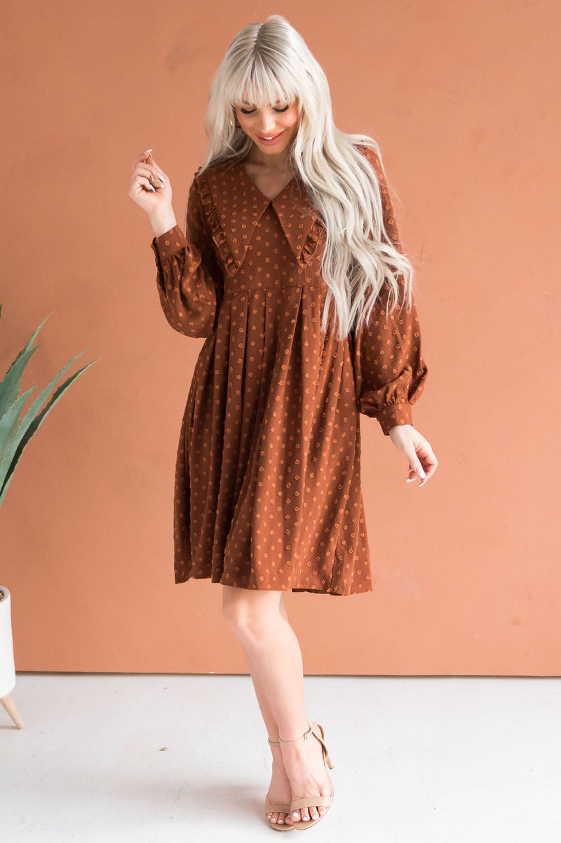 Our new Janeil dress is drop dead gorgeous! This beauty features a v-neckline with a trendy peter pan collar, dainty swiss dot throughout, long sleeves cuffed sleeves, and a darling pleated waistline! This dress is sure to sell out, so hurry and gets yours today!