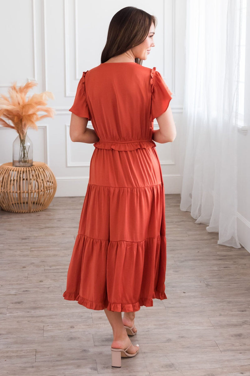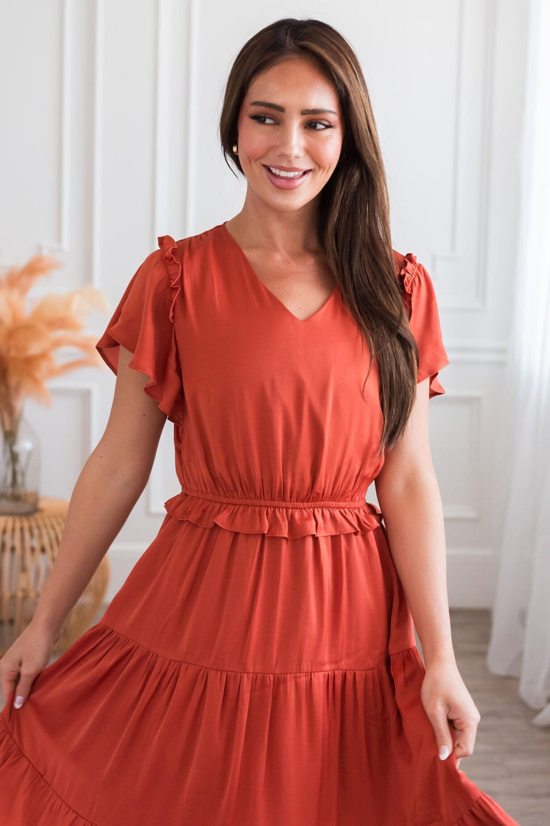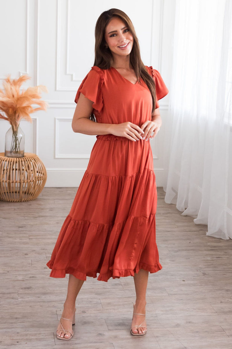Get the lovely Janella today! The lovely satin material is so feminine and soft! Accompanied by the beautiful tiered skirt, short flutter sleeves and soft v-neck. This dress is a Fall must have!