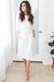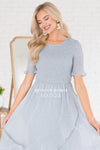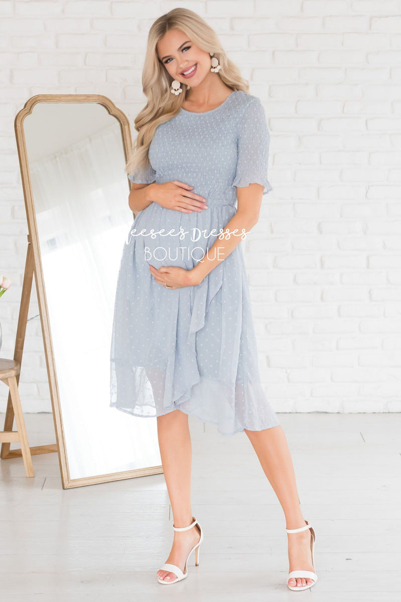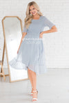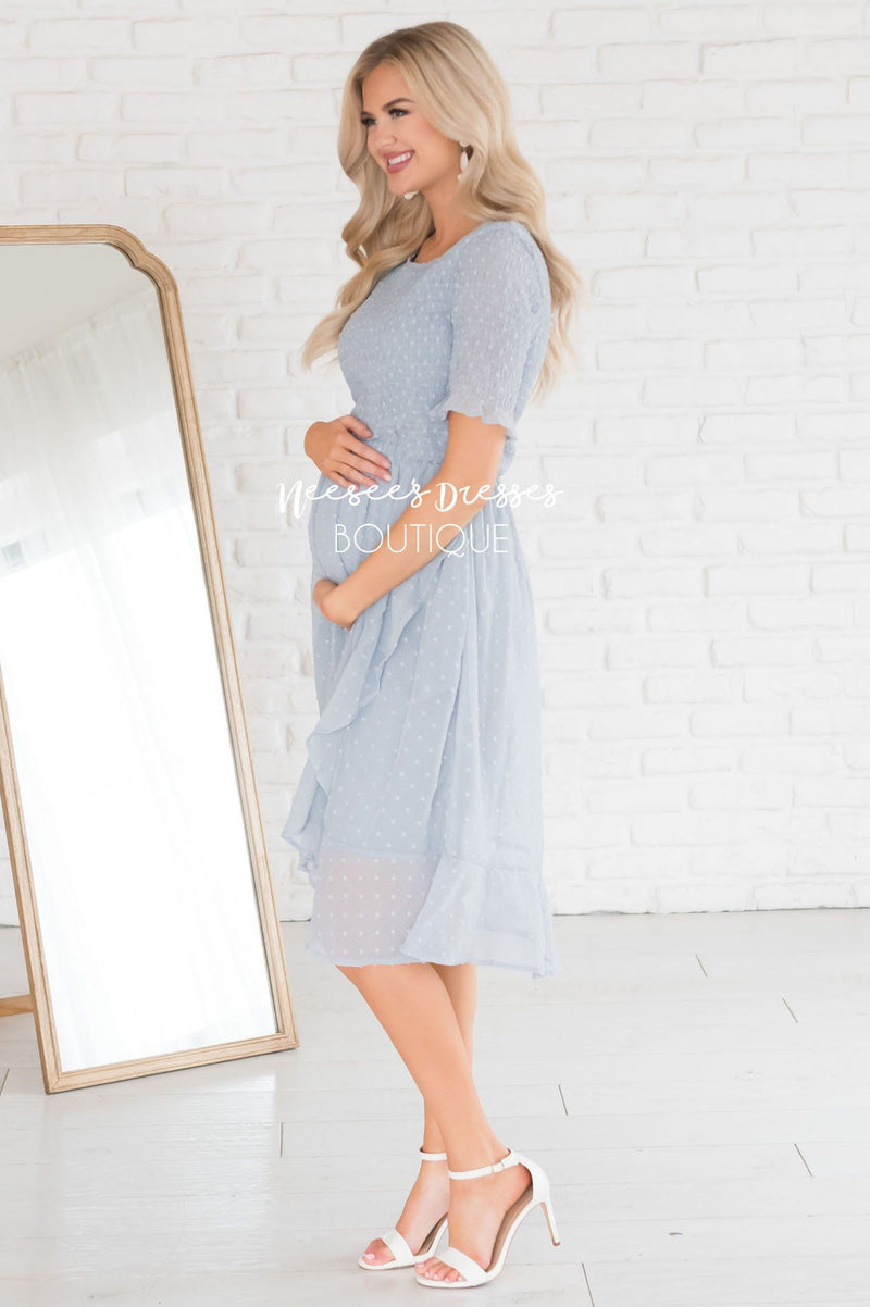 Our gorgeous Janina will have you prepared for anything life has to throw at you! We are in love with the swiss dotting on the sheer feminine material so unique, so classy. Plus, how darling is the flowy ruffle wrap skirt?! Other things to love flattering shirred bodice with modest round neckline, half fitted sleeves, elastic waistband and it comes fully lined.