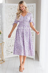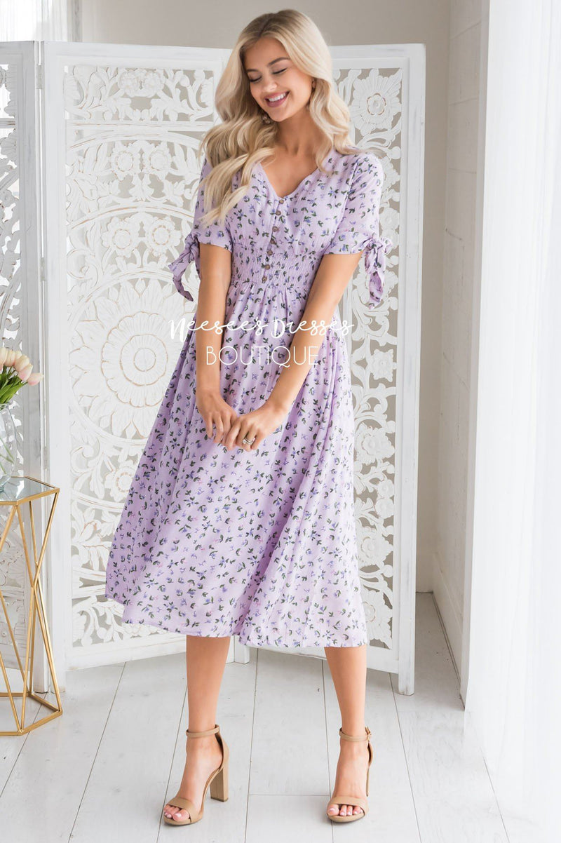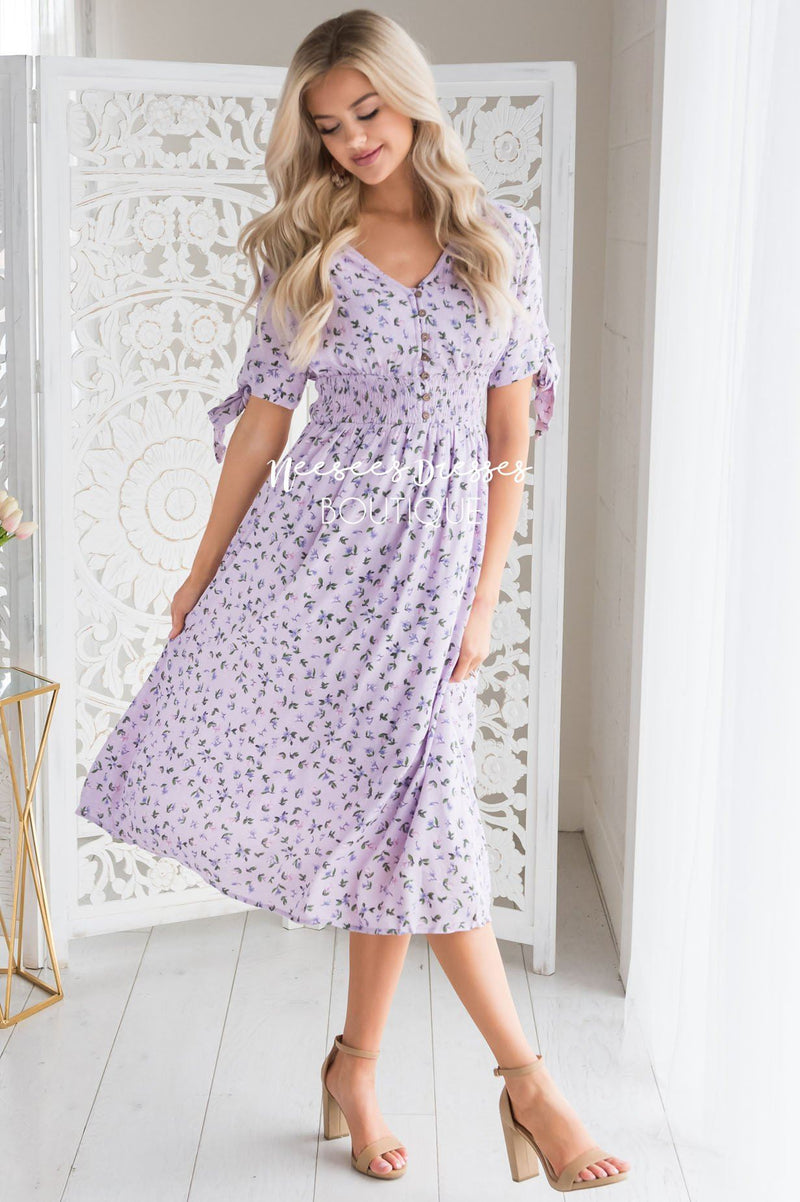 The lovely modest Jaymi has just hit our site and we couldn't be happier! This darling dress is so classy and perfect for spring and summer! Featuring a v-neck functional button front bodice, a shirred elastic waistband, unbelievably cute tie short sleeves and a lined full skirt. You simply can not go wrong with this one!