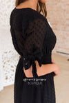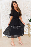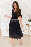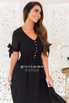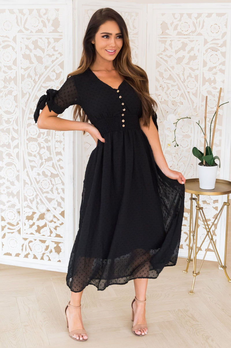 The lovely modest Jaymi has just hit our site and we couldn't be happier! This darling dress is so classy and perfect for spring and summer! Featuring a v-neck functional button front bodice, a shirred elastic waistband, unbelievably cute tie short sleeves and a lined full skirt. You simply can not go wrong with this one!