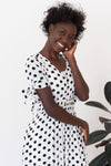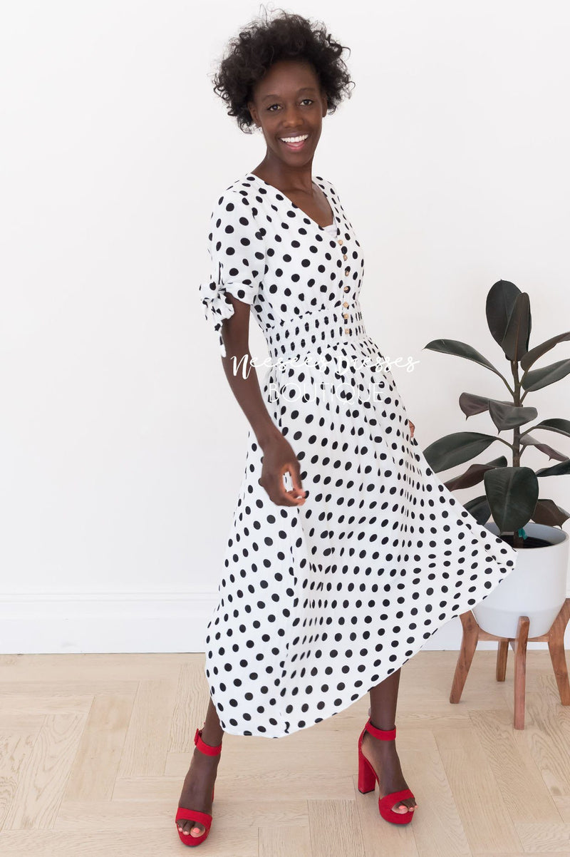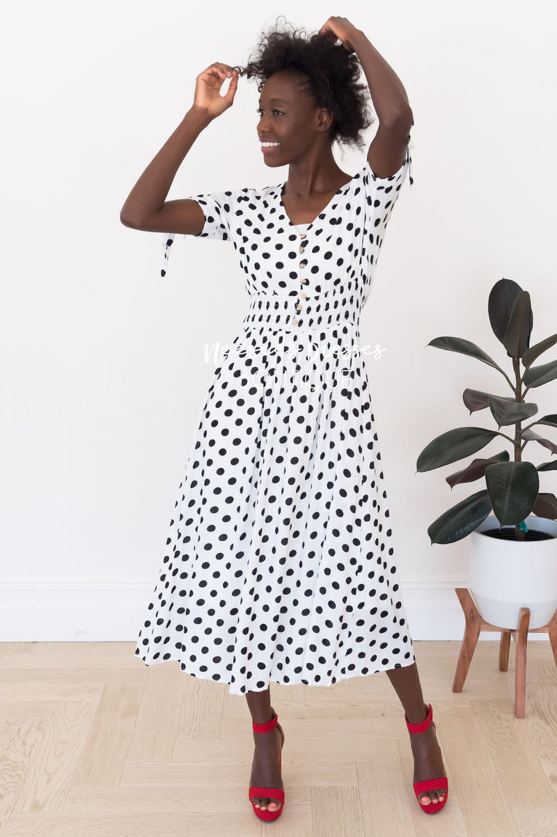 The lovely modest Jaymi has just hit our site and we couldn't be happier! This darling dress is so classy and perfect for all seasons! Featuring a v-neck functional button front bodice, a shirred elastic waistband, unbelievably cute tie short sleeves and a lined full skirt. You simply can not go wrong with this one!