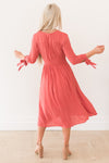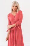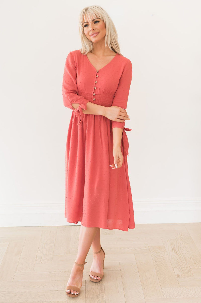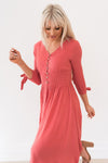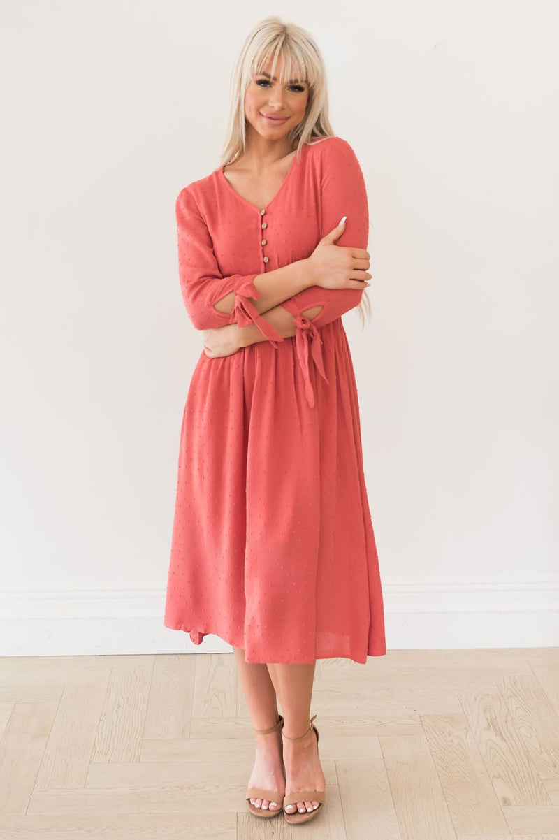 This stylish and fashionable dress is perfect for you! The delicate swiss dot fabric, gorgeous rose pink color, functional button down front, cinched waist, and tie detailing on the 3/4th length sleeves will make you want this dress now! The dress is lovely, flowy, lightweight and perfect for the fall! This beauty is also nursing friendly!