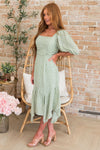 If you have been on search for the perfect dress, we have the one for you! Our lovely modest, Jeana, took our breath away. This green floral dress features a feminine squared neckline, flattering ruched waistline, adorable puff sleeves, and a perfect length ruffled handkerchief skirt. Act fast and get yours today!