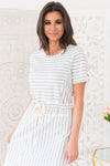 Been on the search for the perfect casual summertime dress? We have got the perfect fit for you, the Jeannie is a striped summer time beauty! Featuring round neckline, short sleeves, drawstring waistline and the perfect modest length. Get yours today!