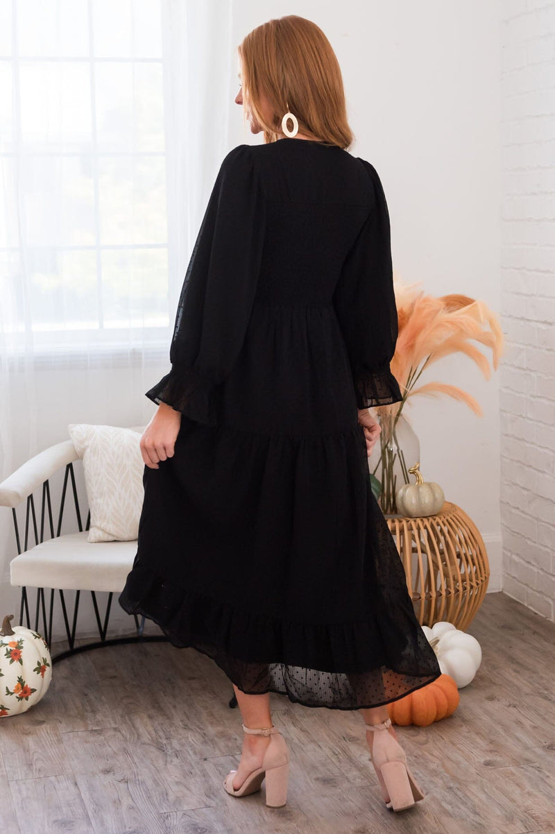 We have the most gorgeous modest dress of your dreams. We are swooning over our feminine Jeena dress. Dress features include, sheer swiss dot fabric, lovely modest v-neckline with fuctional button front bodice, long ruffle wrist sleeves, and a flowy maxi length skirt. Do not sleep on this beauty, hurry and get yours today.