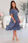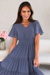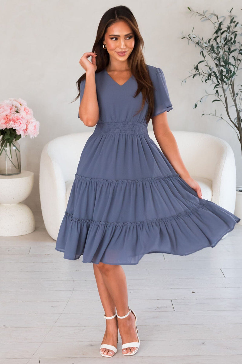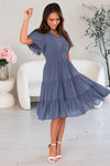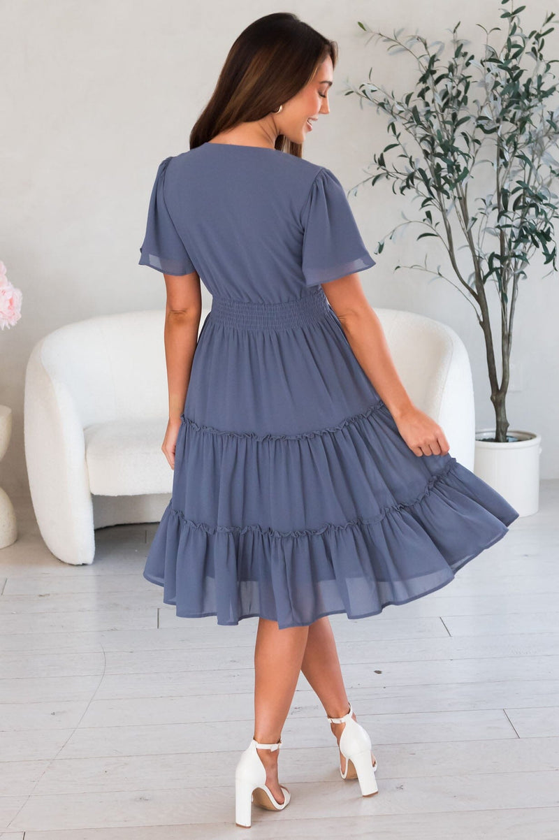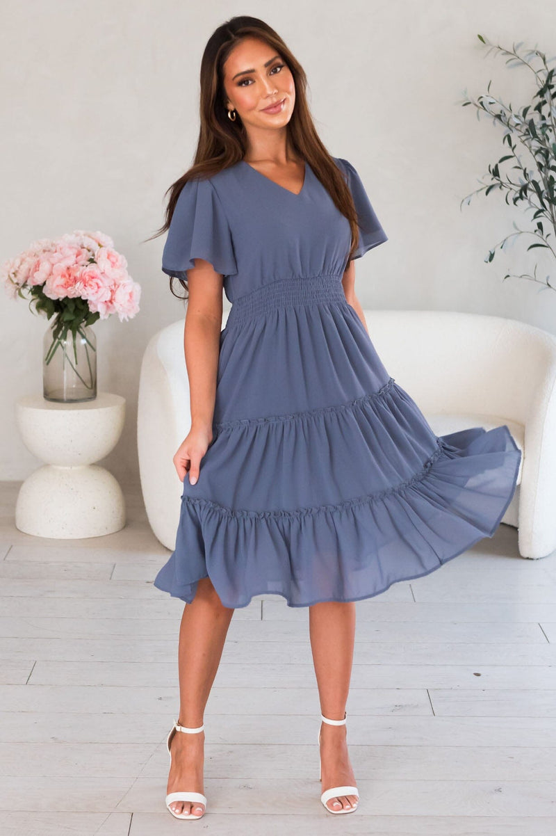 The gorgeous feminine Jemma has stolen the show! We are loving the lovely slate blue color, short flutter sleeves, soft v-neckline, smocked waistline and flowy tiered skirt. Get yours today, these beauties will go fast!