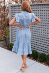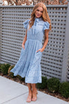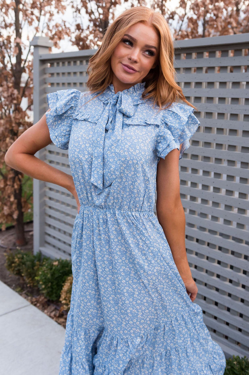 If you have been on search for the perfect Springtime dress, we have the one for you! Our lovely modest, Jency, took our breath away. This blue & white floral dress features a feminine ruffled tie neckline, adorable double ruffled flutter sleeves, and a perfect length tiered skirt. Act fast and get yours today!