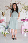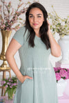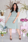 This new dress is such an effortless cute choice for spring fun! Featuring a darling shade of sage complimented by a thin ivory stripe creating the perfect spring combination! This dress also features an aline fit, short sleeves and side pockets.