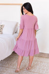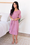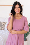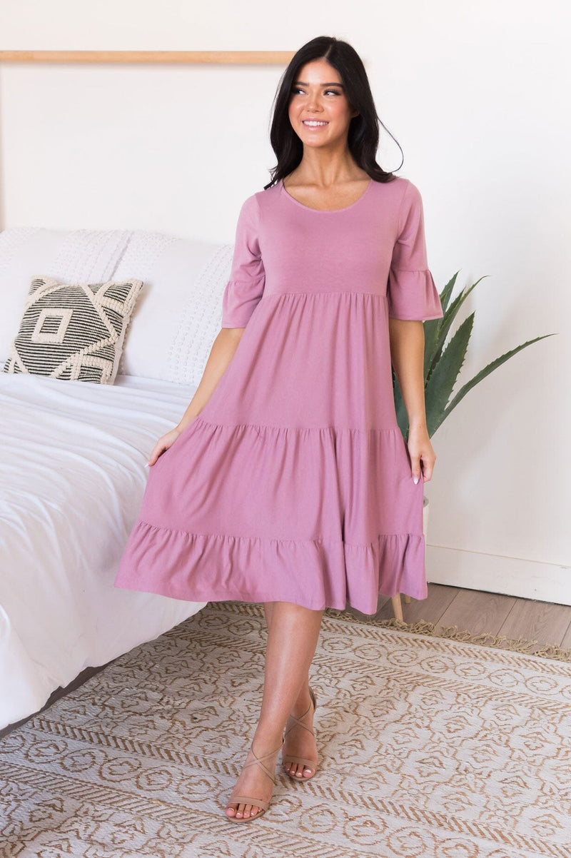 This new modest dress is just what you've been looking for. We love a dress that is easy to just throw on and go (trust us, we know how busy you are!) Simple and cute, this tiered dress features half sleeves with a ruffle hem.