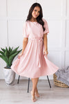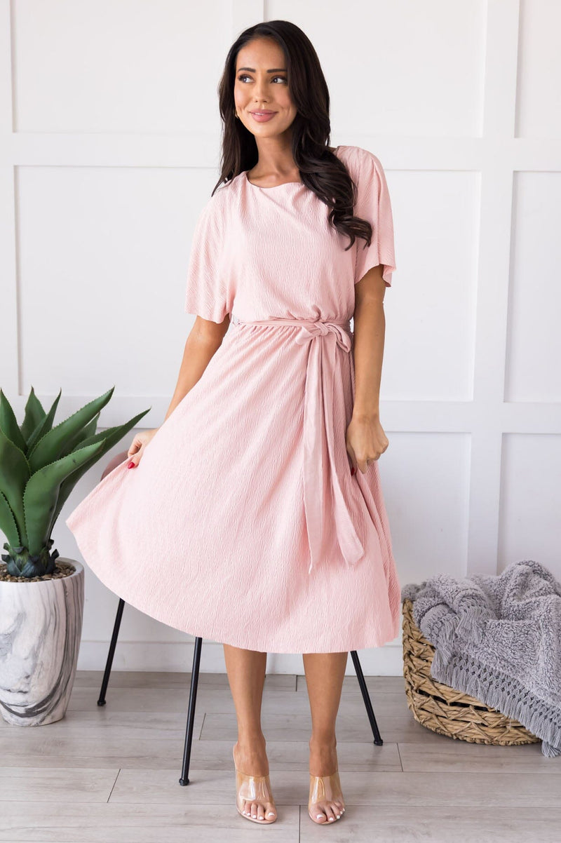 The Jennifer is a real stunner! This beautiful dusty pink crinkle fabric dress has so many must have features, including a modest neckline with dolman styles short sleeves, belt tie waistline and twirl worthy skirt, this one stole our attention from the get go! This dress is a must have!