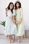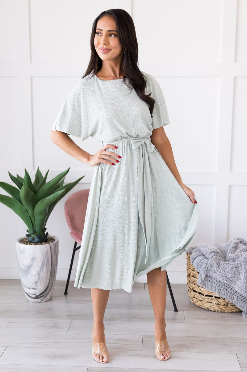 The Jennifer is a real stunner! This beautiful sage crinkle fabric dress has so many must have features, including a modest neckline with dolman styles short sleeves, belt tie waistline and twirl worthy skirt, this one stole our attention from the get go! This dress is a must have!