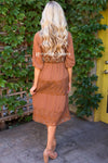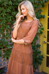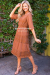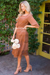 The Jeriann has arrived and in the most gorgeous fall shade! Stunning lace overlay and the sweet delicate swiss dot detailing has got us hooked! Once you see this piece you are going to fall in love! The Jeriann, features a round neckline, keyhole button back closure, 3/4 length puff sleeves and comes fully lined.
