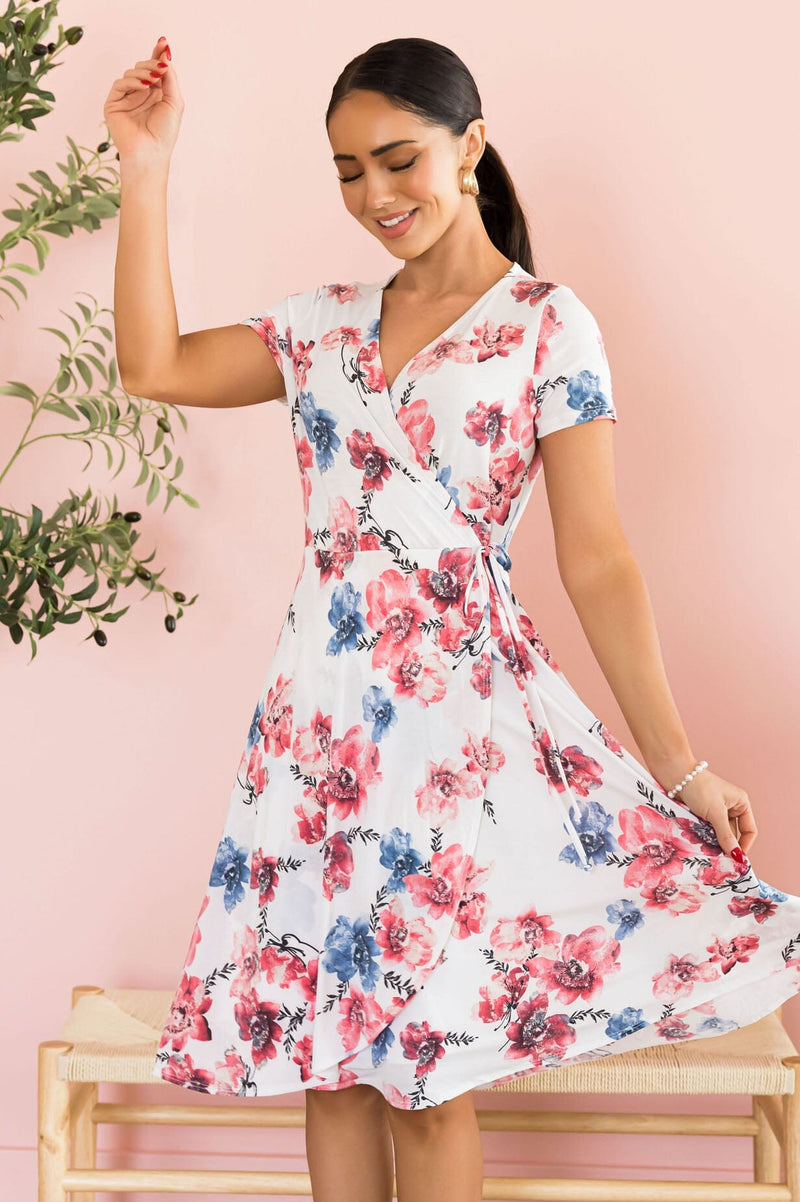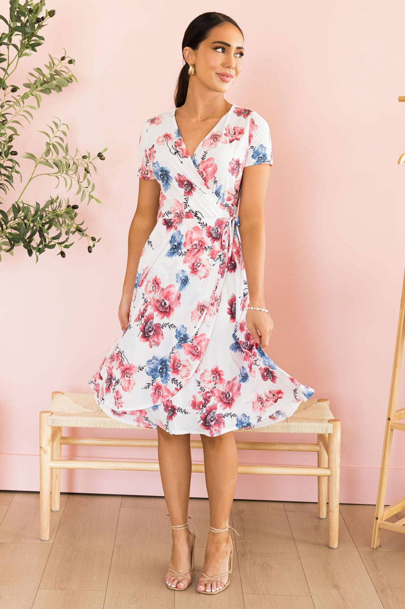 We've got the best new classic modest go to dress for you! The Jerianne features short sleeves, the most cozy buttery soft fabric, faux wrap style and a flowy skirt. Get yours today, these beauties won't last long!